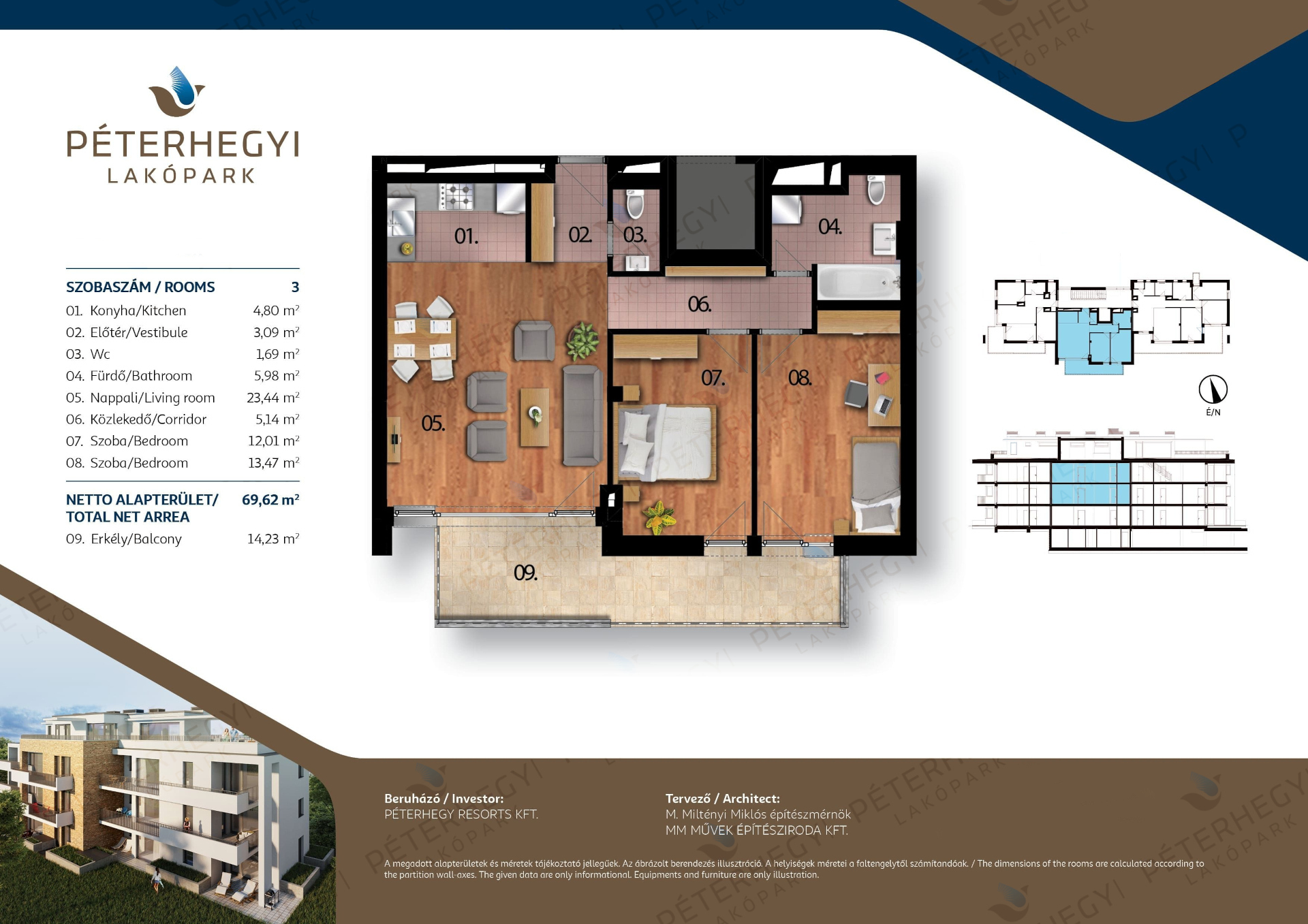 Az alaprajz praktikus és élhető: a lakás 3 szobából áll, amelyek közül a nappali–étkező–konyha tágas központi élettérként szolgál, míg a hálószobák szeparáltan helyezkednek el, biztosítva a privát szférát. A 1 fürdőszoba a mindennapok kényelmét szolgálja, a 14 m²-es terasz/erkély pedig tökéletes helyszínt kínál egy reggeli kávéhoz vagy esti kikapcsolódáshoz. A lakás teljes alapterülete 69.62 m², amelyet praktikus elrendezés és jól kihasználható terek jellemeznek.