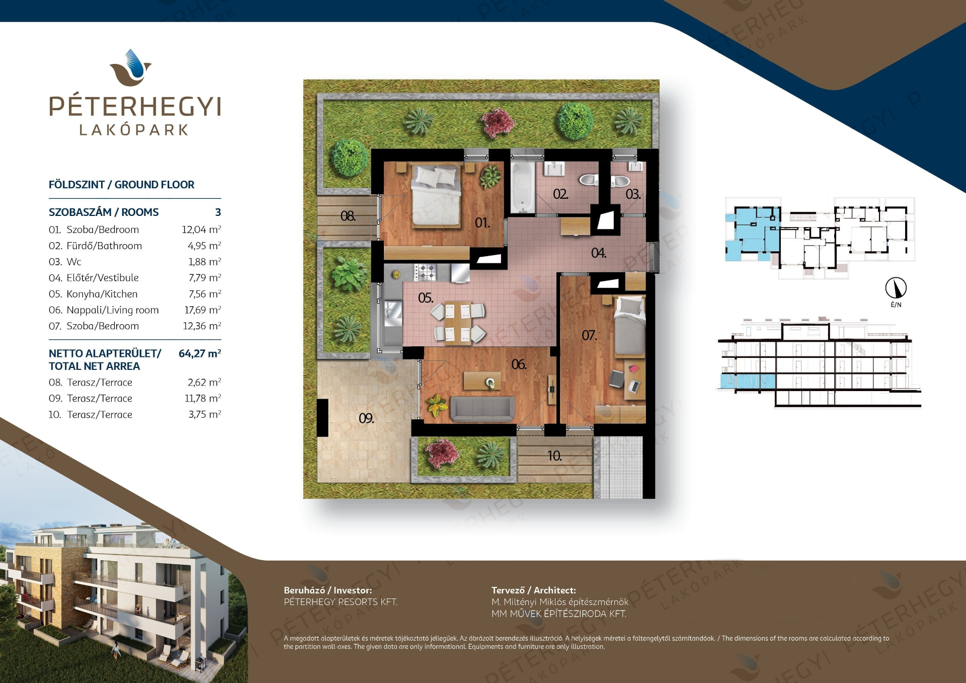 Az alaprajz praktikus és élhető: a lakás 3 szobából áll, amelyek közül a nappali–étkező–konyha tágas központi élettérként szolgál, míg a hálószobák szeparáltan helyezkednek el, biztosítva a privát szférát. A 1 fürdőszoba a mindennapok kényelmét szolgálja, a 18.15 m²-es terasz/erkély pedig tökéletes helyszínt kínál egy reggeli kávéhoz vagy esti kikapcsolódáshoz. A lakás teljes alapterülete 64.27 m², amelyet praktikus elrendezés és jól kihasználható terek jellemeznek.