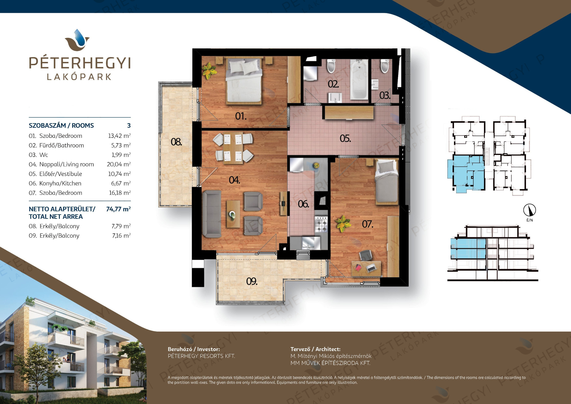 Az alaprajz praktikus és élhető: a lakás 3 szobából áll, amelyek közül a nappali–étkező–konyha tágas központi élettérként szolgál, míg a hálószobák szeparáltan helyezkednek el, biztosítva a privát szférát. A 1 fürdőszoba a mindennapok kényelmét szolgálja, a 14.95 m²-es terasz/erkély pedig tökéletes helyszínt kínál egy reggeli kávéhoz vagy esti kikapcsolódáshoz. A lakás teljes alapterülete 74.77 m², amelyet praktikus elrendezés és jól kihasználható terek jellemeznek.