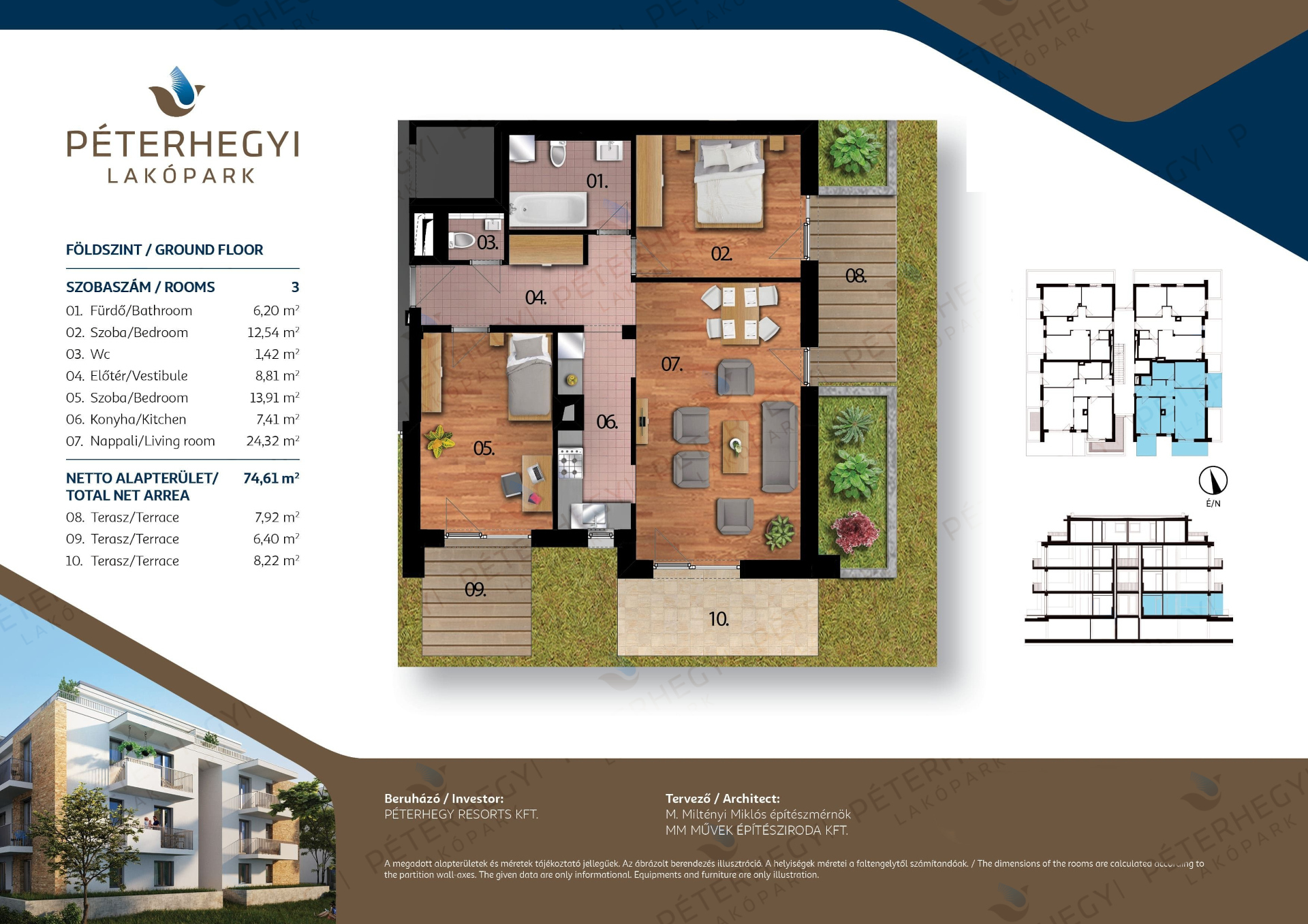 Az alaprajz praktikus és élhető: a lakás 3 szobából áll, amelyek közül a nappali–étkező–konyha tágas központi élettérként szolgál, míg a hálószobák szeparáltan helyezkednek el, biztosítva a privát szférát. A 1 fürdőszoba a mindennapok kényelmét szolgálja, a 22.54 m²-es terasz/erkély pedig tökéletes helyszínt kínál egy reggeli kávéhoz vagy esti kikapcsolódáshoz. A lakás teljes alapterülete 74.61 m², amelyet praktikus elrendezés és jól kihasználható terek jellemeznek.