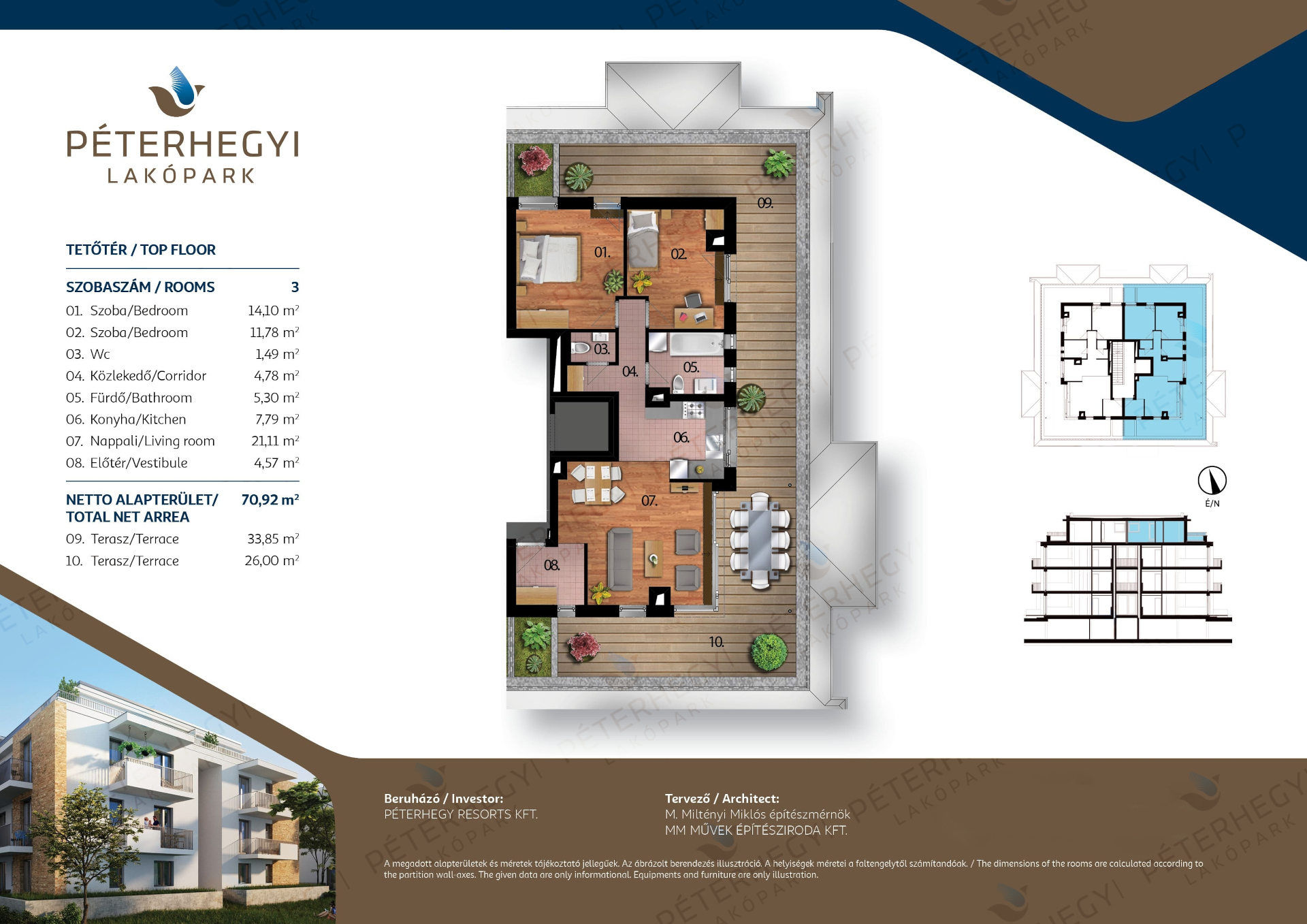 Az alaprajz praktikus és élhető: a lakás 3 szobából áll, amelyek közül a nappali–étkező–konyha tágas központi élettérként szolgál, míg a hálószobák szeparáltan helyezkednek el, biztosítva a privát szférát. A 1 fürdőszoba a mindennapok kényelmét szolgálja, a 70.92 m²-es terasz/erkély pedig tökéletes helyszínt kínál egy reggeli kávéhoz vagy esti kikapcsolódáshoz. A lakás teljes alapterülete 59.85 m², amelyet praktikus elrendezés és jól kihasználható terek jellemeznek.