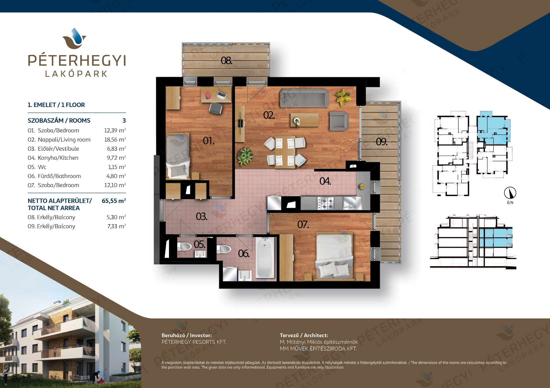 Az alaprajz praktikus és élhető: a lakás 3 szobából áll, amelyek közül a nappali–étkező–konyha tágas központi élettérként szolgál, míg a hálószobák szeparáltan helyezkednek el, biztosítva a privát szférát. A 1 fürdőszoba a mindennapok kényelmét szolgálja, a 12.33 m²-es terasz/erkély pedig tökéletes helyszínt kínál egy reggeli kávéhoz vagy esti kikapcsolódáshoz. A lakás teljes alapterülete 65.55 m², amelyet praktikus elrendezés és jól kihasználható terek jellemeznek.