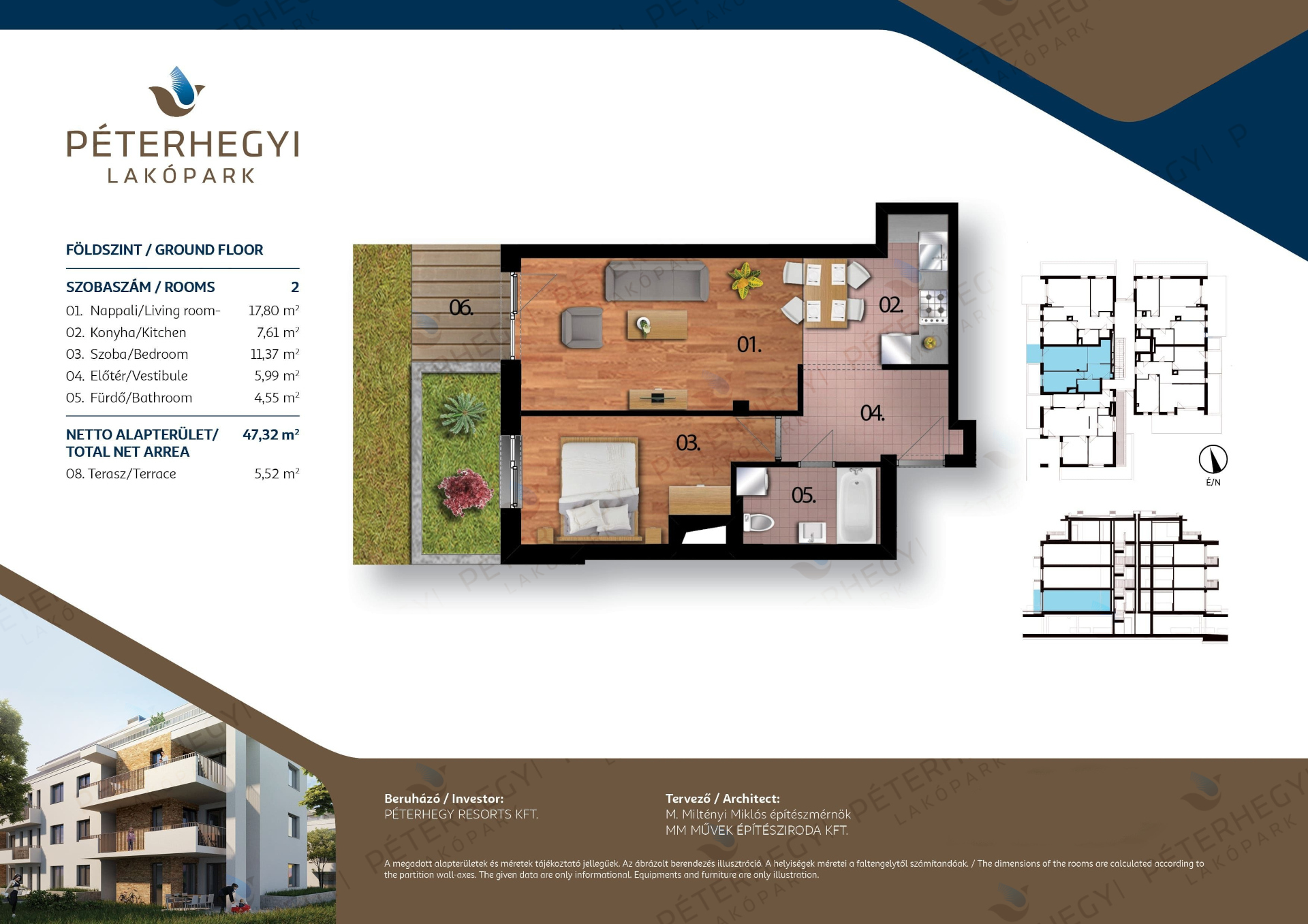 Az alaprajz praktikus és élhető: a lakás 2 szobából áll, amelyek közül a nappali–étkező–konyha tágas központi élettérként szolgál, míg a hálószobák szeparáltan helyezkednek el, biztosítva a privát szférát. A 1 fürdőszoba a mindennapok kényelmét szolgálja, a 5.52 m²-es terasz/erkély pedig tökéletes helyszínt kínál egy reggeli kávéhoz vagy esti kikapcsolódáshoz. A lakás teljes alapterülete 47.32 m², amelyet praktikus elrendezés és jól kihasználható terek jellemeznek.
