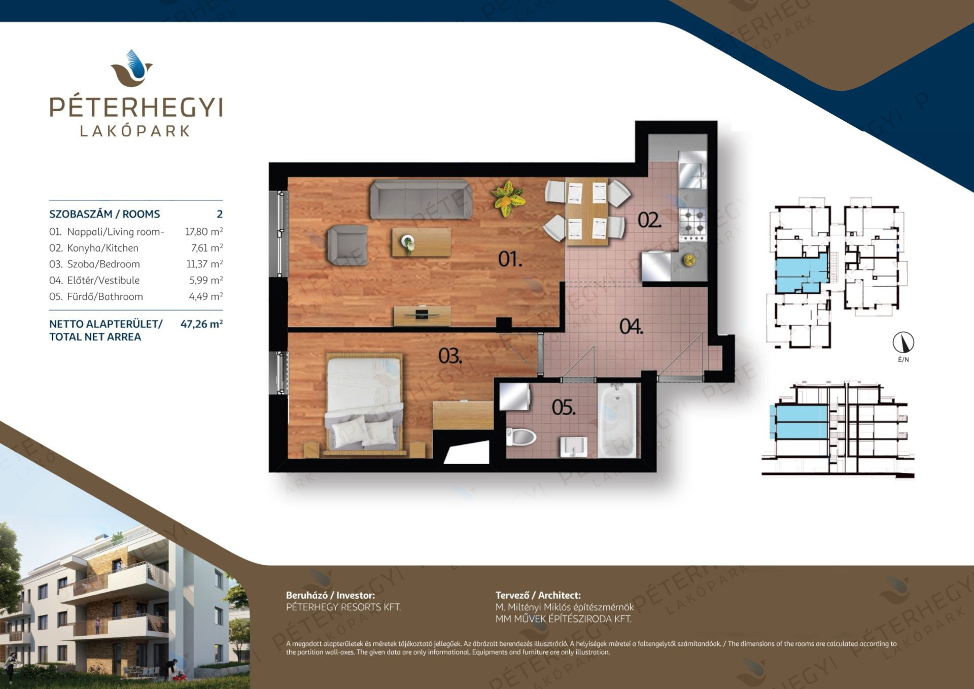 Az alaprajz praktikus és élhető: a lakás 2 szobából áll, amelyek közül a nappali–étkező–konyha tágas központi élettérként szolgál, míg a hálószobák szeparáltan helyezkednek el, biztosítva a privát szférát. A 1 fürdőszoba a mindennapok kényelmét szolgálja. A lakás teljes alapterülete 47.26 m², amelyet praktikus elrendezés és jól kihasználható terek jellemeznek.