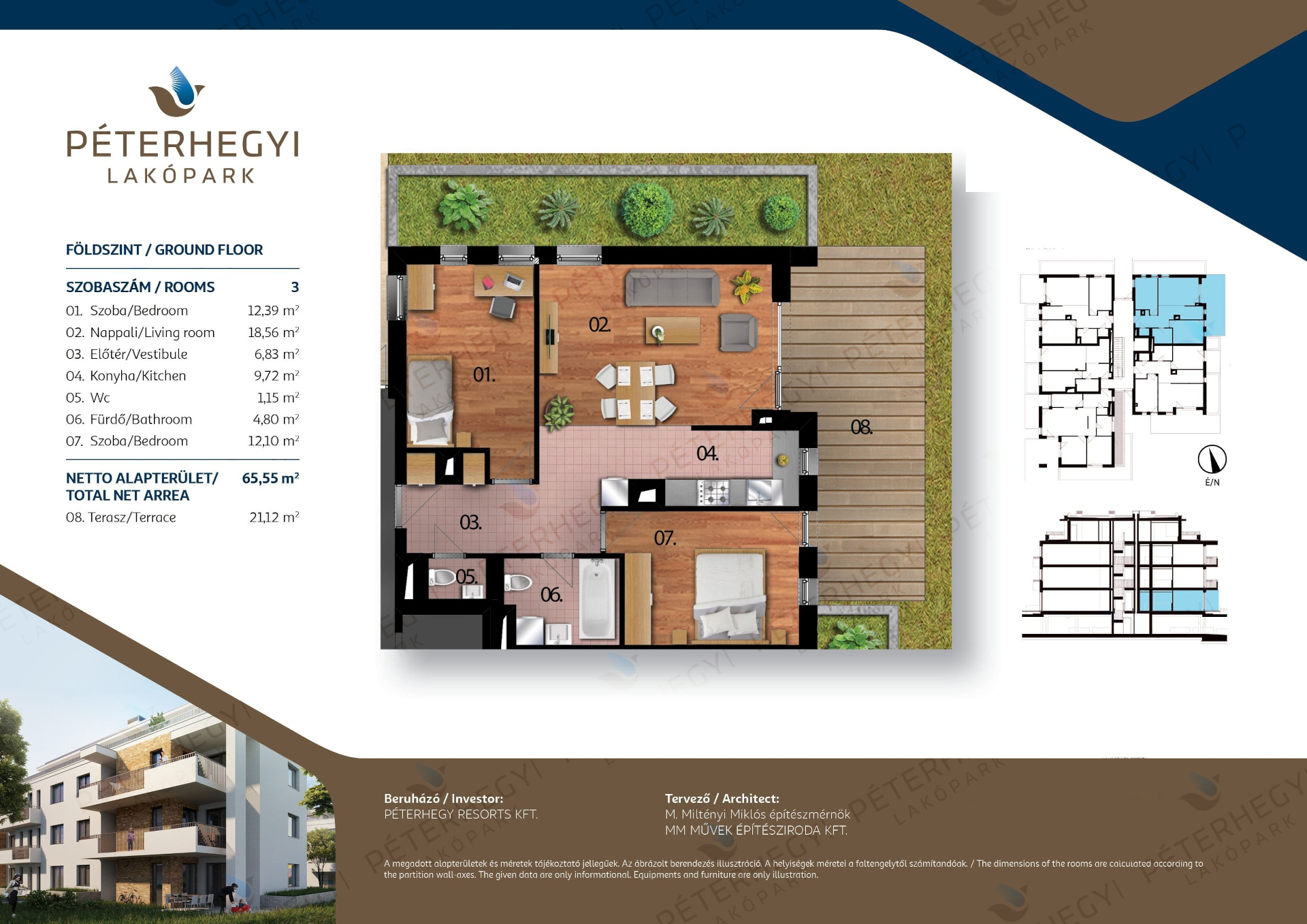Az alaprajz praktikus és élhető: a lakás 3 szobából áll, amelyek közül a nappali–étkező–konyha tágas központi élettérként szolgál, míg a hálószobák szeparáltan helyezkednek el, biztosítva a privát szférát. A 1 fürdőszoba a mindennapok kényelmét szolgálja, a 21.12 m²-es terasz/erkély pedig tökéletes helyszínt kínál egy reggeli kávéhoz vagy esti kikapcsolódáshoz. A lakás teljes alapterülete 65.55 m², amelyet praktikus elrendezés és jól kihasználható terek jellemeznek.