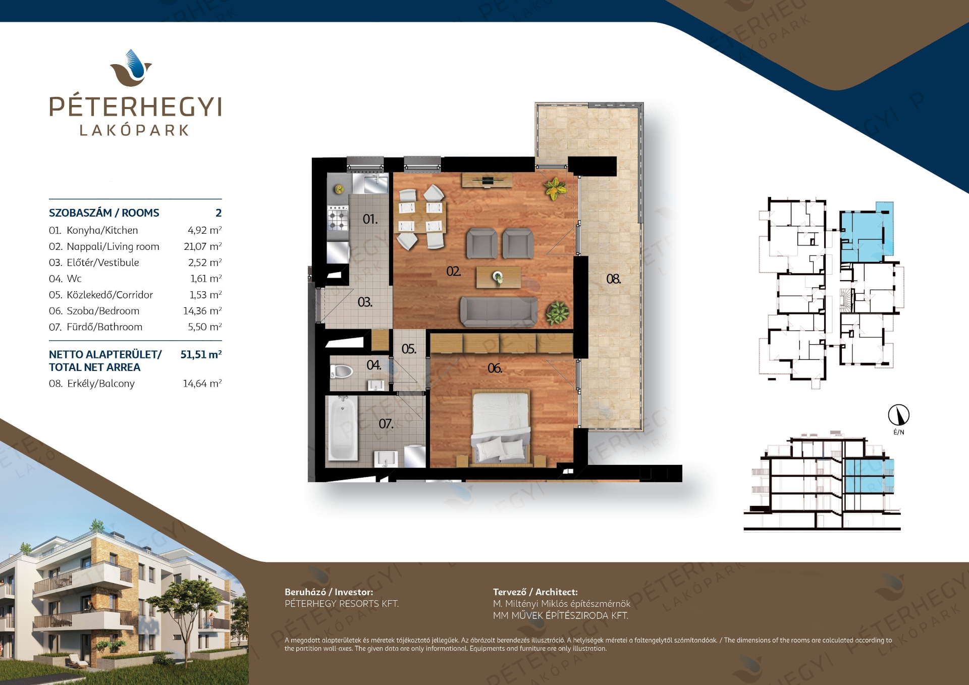 Az alaprajz praktikus és élhető: a lakás 2 szobából áll, amelyek közül a nappali–étkező–konyha tágas központi élettérként szolgál, míg a hálószobák szeparáltan helyezkednek el, biztosítva a privát szférát. A 1 fürdőszoba a mindennapok kényelmét szolgálja, a 14.64 m²-es terasz/erkély pedig tökéletes helyszínt kínál egy reggeli kávéhoz vagy esti kikapcsolódáshoz. A lakás teljes alapterülete 51.51 m², amelyet praktikus elrendezés és jól kihasználható terek jellemeznek.