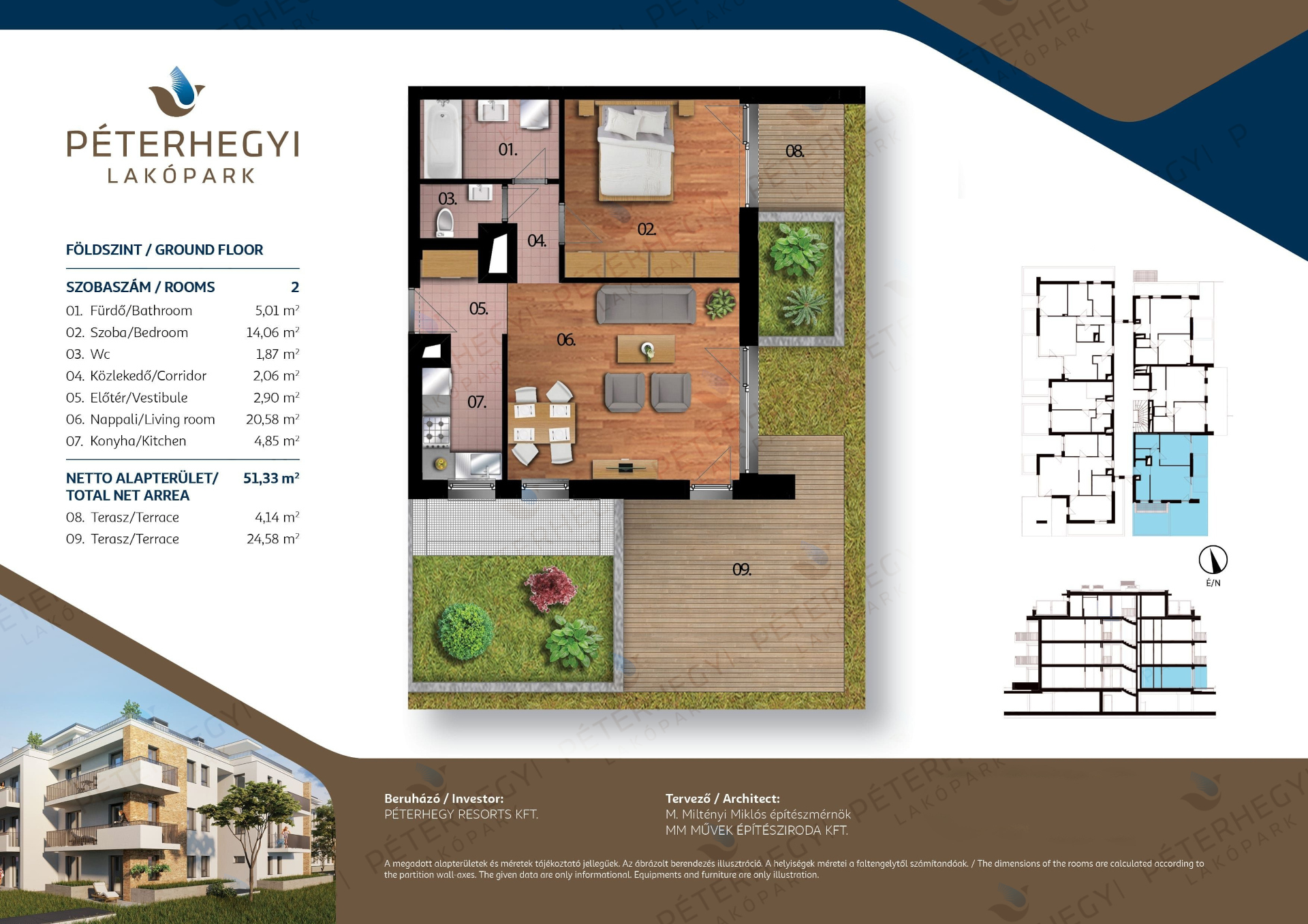 Az alaprajz praktikus és élhető: a lakás 2 szobából áll, amelyek közül a nappali–étkező–konyha tágas központi élettérként szolgál, míg a hálószobák szeparáltan helyezkednek el, biztosítva a privát szférát. A 1 fürdőszoba a mindennapok kényelmét szolgálja, a 28.72 m²-es terasz/erkély pedig tökéletes helyszínt kínál egy reggeli kávéhoz vagy esti kikapcsolódáshoz. A lakás teljes alapterülete 51.33 m², amelyet praktikus elrendezés és jól kihasználható terek jellemeznek.
