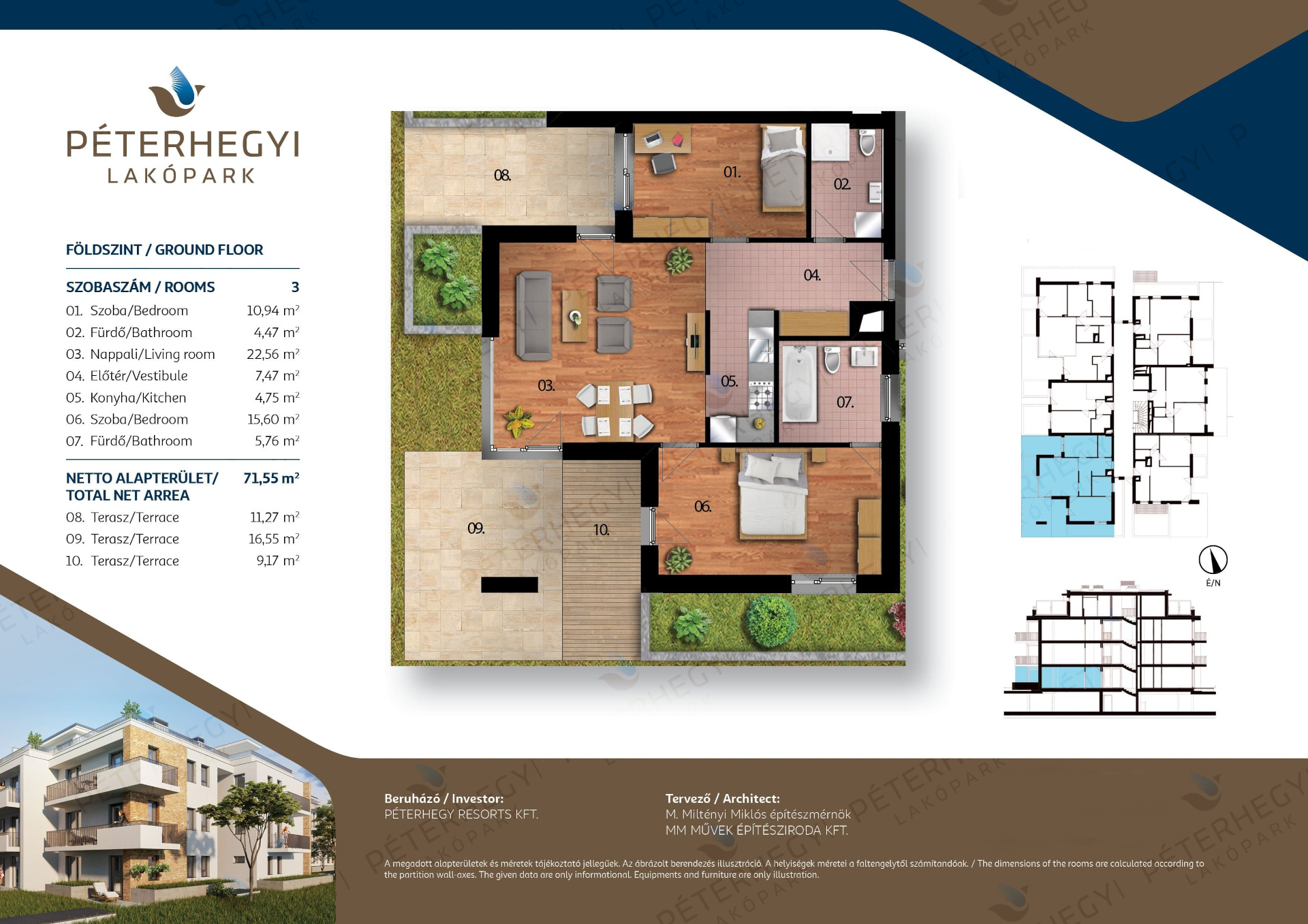 Az alaprajz praktikus és élhető: a lakás 3 szobából áll, amelyek közül a nappali–étkező–konyha tágas központi élettérként szolgál, míg a hálószobák szeparáltan helyezkednek el, biztosítva a privát szférát. A 2 fürdőszoba a mindennapok kényelmét szolgálja, a 36.99 m²-es terasz/erkély pedig tökéletes helyszínt kínál egy reggeli kávéhoz vagy esti kikapcsolódáshoz. A lakás teljes alapterülete 71.55 m², amelyet praktikus elrendezés és jól kihasználható terek jellemeznek.