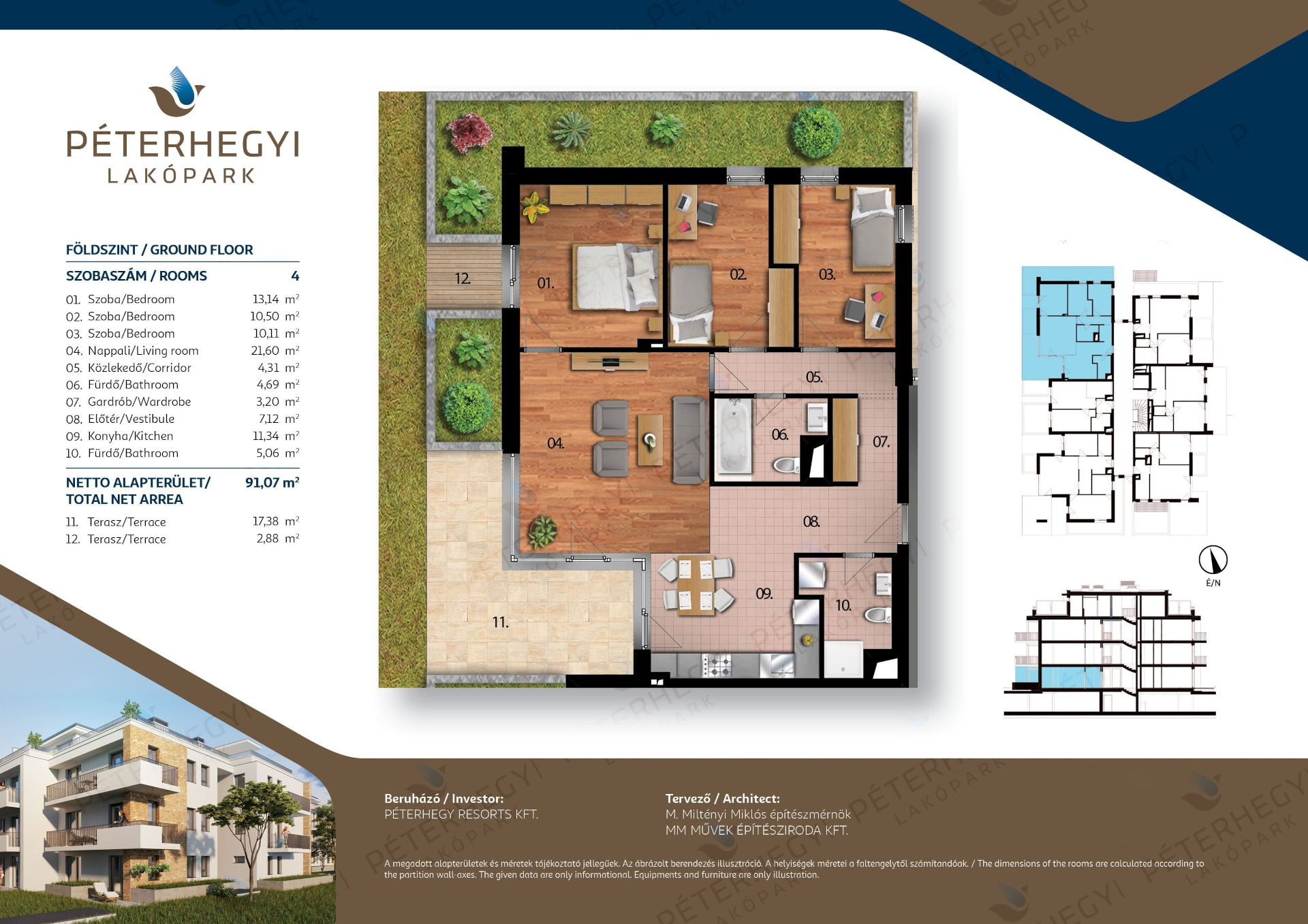 Az alaprajz praktikus és élhető: a lakás 4 szobából áll, amelyek közül a nappali–étkező–konyha tágas központi élettérként szolgál, míg a hálószobák szeparáltan helyezkednek el, biztosítva a privát szférát. A 2 fürdőszoba a mindennapok kényelmét szolgálja, a 20.26 m²-es terasz/erkély pedig tökéletes helyszínt kínál egy reggeli kávéhoz vagy esti kikapcsolódáshoz. A lakás teljes alapterülete 91.07 m², amelyet praktikus elrendezés és jól kihasználható terek jellemeznek.